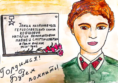 В районе Очаково-Матвеевское есть улица Наташи Ковшовой. На этой улице расположен Клуб «Мозаика», в котором я обучаюсь рисованию. Мы часто ходим к мемориальной доске, расположенной на доме клуба, и возлагаем цветы. Нам рассказывали о подвиге этой юной и храброй девушки. Я решила изобразить не только портрет Наташи Ковшовой, но и мемориальную табличку.