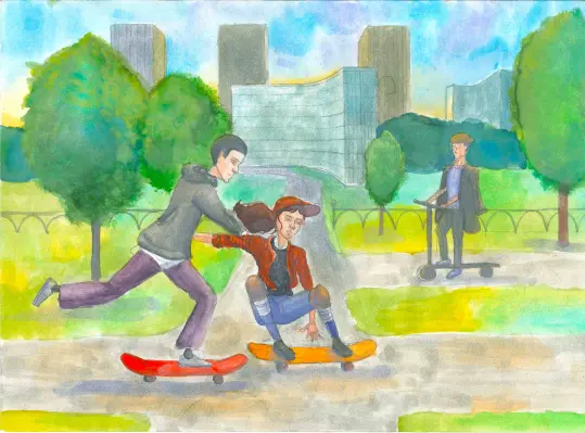 Меня зовут Марьяна, мне 14 лет. Я занималась в школьном художественном кружке 5 лет. На моем рисунке я изобразила себя и своего старшего брата в нашем любимом правке в Чертаново.