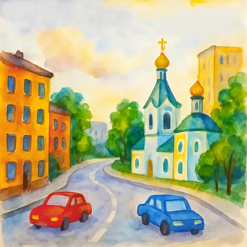 Яркий, сочный рисунок красками передаёт оживлённую улочку в самом сердце Москвы. По центру композиции тянется широкая дорога, по которой мчатся две разноцветные машинки — одна красная, другая синяя, будто спешащие по важным делам.