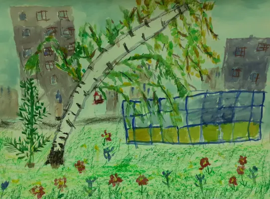 Я рисовала наш двор, который находится недалеко от центра творчества и спорта, куда я хожу заниматься рисованием и танцами.