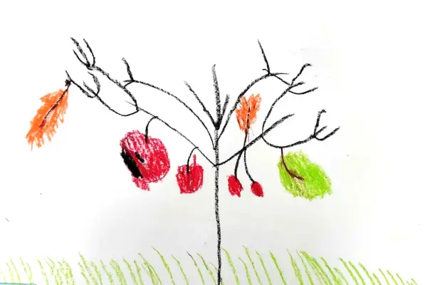 На рисунке изображено дерево дикой вишни, которая растёт у меня во дворе очень давно. Она росла вместе со мной,и когда я смотрю на неё, у меня возникают теплые чувства, поэтому я решил её нарисовать.