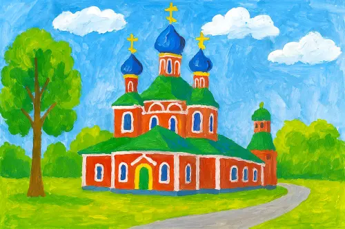 Рисунок запечатлел Церковь Иоанна Воина в районе Якиманка, прекрасный образец московской архитектуры. Центральное место композиции занимает величественное здание храма, выделяющееся своей архитектурной выразительностью. Видна сложная, многоярусная композиция, характерная для русской церковной архитектуры: высокий купол, увенчанный крестом, обрамленный изящными арками и декоративными элементами. Детали рисунка проработаны с тщательностью: можно различить отдельные кирпичики кладки, изящную резьбу наличников окон и сложную орнаментацию на стенах. Церковь окружает пространство, возможно, изображенный на рисунке фрагмент прилегающего сквера или улицы, добавляющий глубины и контекста. Если на рисунке присутствуют деревья или другие элементы окружающей среды, они подчеркивают величественность храма, создавая контраст между его вертикалями и горизонтальными линиями окружающего ландшафта.