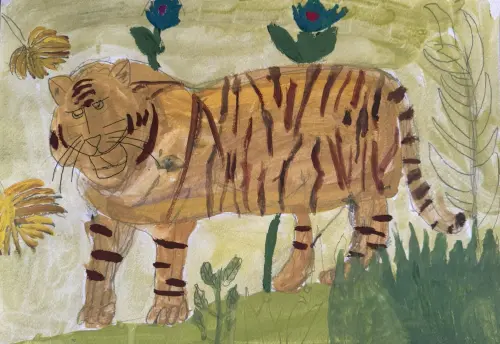 Наш зоопарк в Москве - это мое самое любимое место, туда мы ходим с бабушкой и дедушкой. Там много разных животных. Я очень люблю кошек, и там есть очень большая кошка - это тигр. Вот он и есть на моем рисунке.