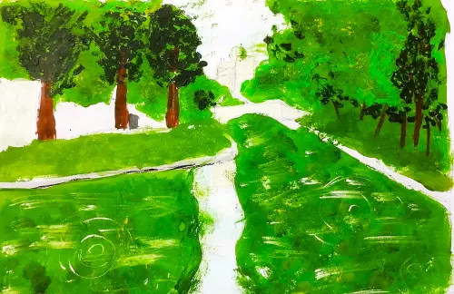 Работа написана гуашью на листе а4. Автор поймал удачный ракурс ландшафтного вида в парке Трубецких. Парк является жемчужиной района Хамовники и здесь отдыхают десятки жителей.