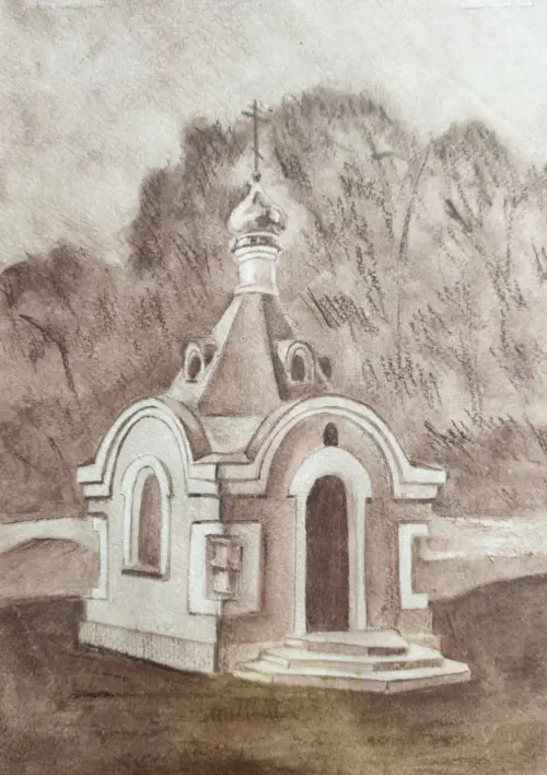 На территории Красной площади расположена маленькая часовня. Очень уютная и красивая часовня. Там всегда очень много туристов из разных стран. На моем рисунке она изображена в историческом виде