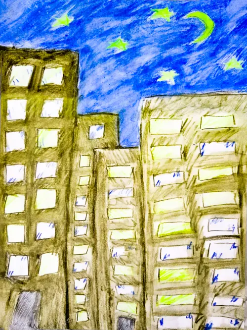 Люблю свой дом, мой район, в котором я родилась, расту, учусь. Летом люблю прогулки перед сном, под звёздным небом это особенно прекрасно. Постарались выразить всё самое прекрасное в этой работе.