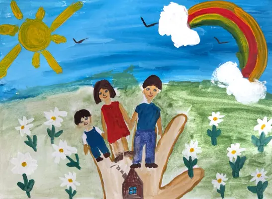 Екатерининский парк в Мещанском районе - самое любимое место прогулок моей семьи. Там очень красиво. Есть большой пруд, где мы часто гуляем. Я решила нарисовать нашу семью на прогулке в этом парке.