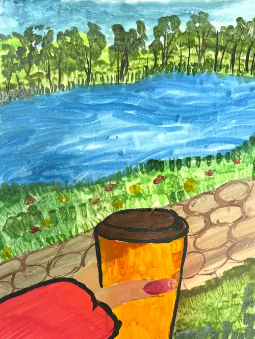 Мы с мамой часто гуляем в парке рядом с домом, я очень люблю эти прогулки. Я беру с собой любимые игрушки, а мама покупает себе кофе. Я нарисовал, как я иду рядом с мамой, в ее руке стаканчик кофе, виден пруд и парк.