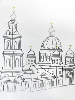 На изображении представлен архитектурный силуэт одного из главных храмов Москвы — Елоховского Богоявленского собора. Рисунок выполнен в линейной технике с акцентом на основные архитектурные элементы: высокие колокольни, купола с крестами, арочные окна и монументальные фасады. Простота линий подчеркивает величие и симметрию классического стиля здания, сохраняя при этом его узнаваемый образ. Елоховский собор — не только духовный центр Басманного района, но и памятник истории, культуры и архитектуры XIX века.