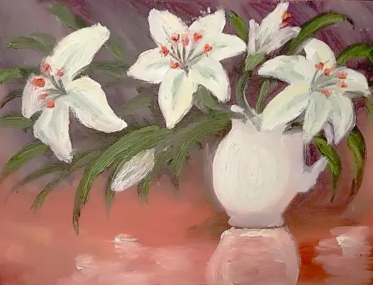 На рисунке изображена изящная лилия, помещённая в стеклянную вазу. Цветок раскрыт во всей своей красоте: крупные, нежно-белые лепестки с лёгким розоватым оттенком плавно изгибаются, создавая ощущение лёгкости и изящества. В центре цветка видны ярко-жёлтые тычинки, придающие композиции живость и контраст. На заднем плане можно различить размытые контуры зелёных листьев и других растений, характерных для Воронцовского парка, что придаёт рисунку природную атмосферу и глубину.