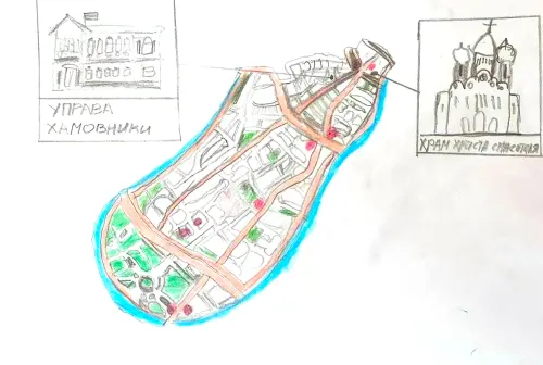 Работа выполнена автором в карандаше и представляет вид с птичьего полета на петлю Москва - реки, опоясывающую Хамовники. На рисунке отмечены 2 достопримечательности: управа Хамовники - исторический дом купчихи Матвеевой и Храм Христа Спасителя - памятник воинской славы России.