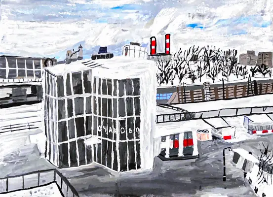 Совсем недавно в районе Очаково открыли новый вокзал. Он очень просторный и удобный. Я нарисовал его с интересного ракурса. Использовал гуашь. Формат А3.