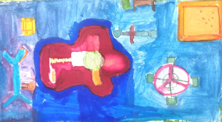 Я придумала свою детскую площадку и нарисовала её план. Она похожа на космическую станцию. Покрытие темно-синее, как пространство космоса. В центре горка в виде космической станции, по краям качели и Карусель как спутник и космический корабль. Может быть эта идея воплотится в жизнь.