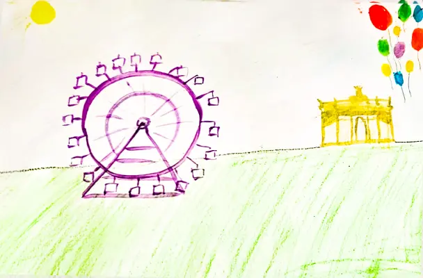 Рисунок колеса обозрения на ВДНХ. Выполнен карандашами и маркером.