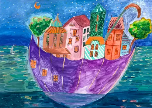 На рисунке изображена Коломенская набережная. После реконструкции набережная стала еще лучше - появилось много деревьев и кустарников, детские и спортивные площадки, зоны отдыха у воды, а также пешеходные и велосипедные маршруты. Здесь есть необычные «подземные» тоннели и даже маленький паровоз. Набережную украшают две изысканные ротонды, а в зонах отдыха размещены столы для игры в шахматы. Коломенская набережная теперь любимое место жителей столицы.