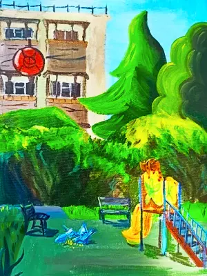 Эта картина представляет собой утренний вид небольшого дворика, в котором расположен мой дом. На работе представлено ранее летнее утро: вокруг всё еще нет людей, но на маленькой площадке, освещаемой теплыми лучами только вставшего солнца, изображена озорливая рыжая кошка, охотящаяся на небольшую стаю серых голубей, доедающих остатки желтого зерна.