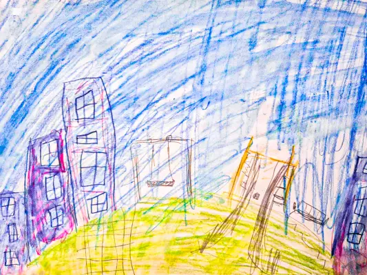 На рисунке мой любимый двор, я очень люблю гулять в нём со своими друзьями. Во дворе есть качели и горки, а ещё есть карусель. Во дворе много деревьев, и, когда жарко или идёт дождь, под ними можно спрятаться.