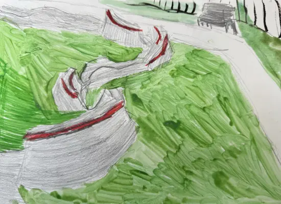 На рисунке изображена прогулка в Воронцовском парке в тёплый солнечный день. В центре композиции видна широкая аллея, по которой неспешно прогуливаются люди разных возрастов: семьи с детьми, пары и одинокие посетители. По обе стороны аллеи растут высокие зелёные деревья, создавая приятную тень и уютную атмосферу.