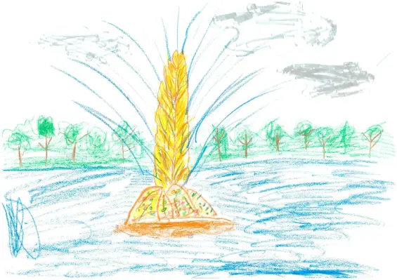 Фонтан, он совсем как в сказке! Он сверкает на солнце, будто сделан из настоящего золота. Мама говорит, что колос – это такой колосок пшеницы, только очень-очень большой. Когда я стою рядом, мне кажется, что я попал в волшебную страну, где всё огромное!