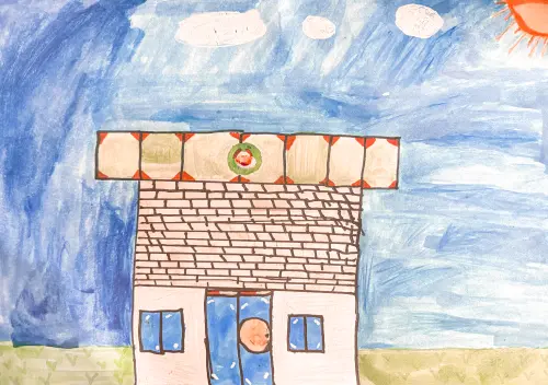 На рисунке я изобразил магазин, в который я хожу чаще всего. Он находится рядом с моим домом, рядом детская площадка, все окружено деревьями. Очень люблю ходить в этот магазин!