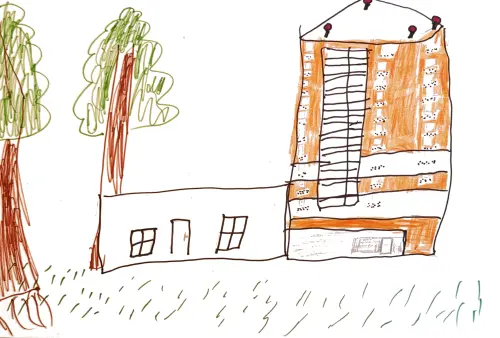 Я нарисовала дом моей любимой бабушки. Мне очень нравится проводить там время вместе с бабушкой. Рядом находится в магазин, окруженный деревьями. Мы часто гуляем с бабушкой возле дома.