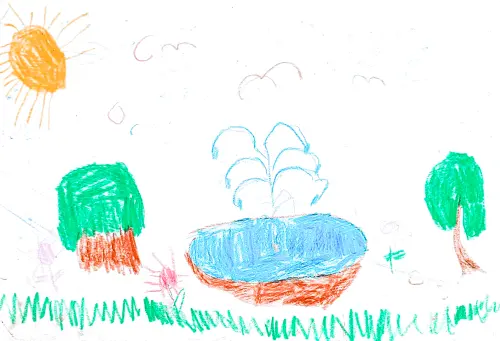 Есть у нас место на районе, где журчит вода, там прохладно, красиво и весело, игровая площадка для детей, скамейки, качели, беседки и, конечно, наш Фонтан.
