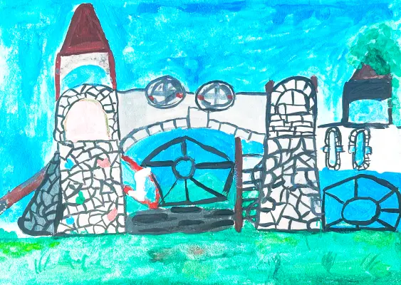 В нашем парке построили очень хорошую детскую площадку. Мы с друзьями любим там гулять и качаться на качелях. На моем рисунке изображен самый большой детский комплекс в нашем селе.