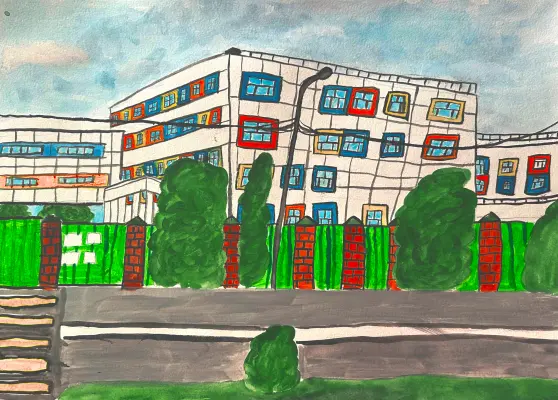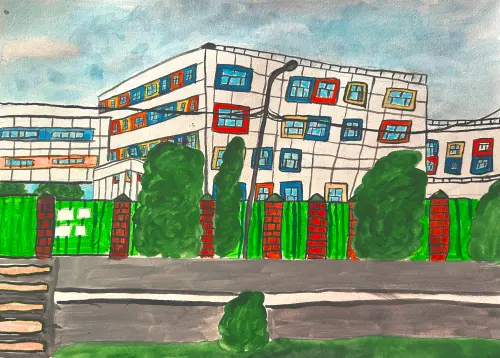 На рисунке я изобразила мою любимую школу, в которой я училась. Не так давно здание нашей старой школы начали ремонтировать, а рядом с ним уже построили новое современное здание.
