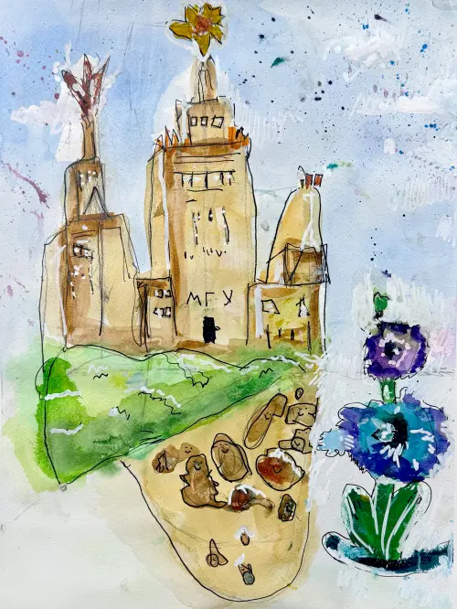 Оля с родителями ездила гулять вокруг главного здания МГУ, которое ее очень впечатлило, так и родился этот рисунок. Маленькая девочка у высокого и величественного здания - храма науки.