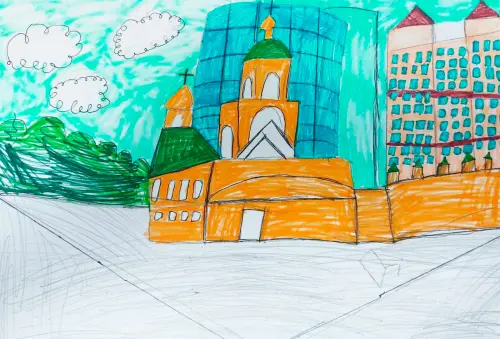 Я нарисовала мой район Преображенское. Одной из множества достопримечательностей нашего района является Детский Черкизовский парк, а также рядом с ним находится храм Илии Пророка.