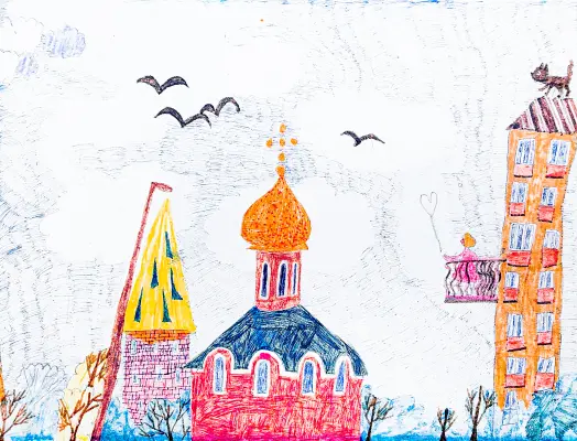 В нашем районе между двух дорог стоит храм Иннокентия. Он большой и очень светлый. Я решил его изобразить. Я ходил туда на праздник Пасхи, носил кулич.