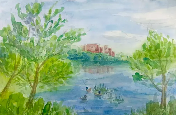 Художественная работа выполнена гуашью на ватмане. Автор изобразила парк Брусиловский, который расположен в районе Щербинка. Этот парк очень красивый и живописный. Привлекает внимание отдыхающих и художников разного возраста.