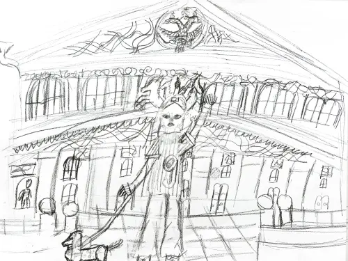 Когда мы пришли, я ахнула! Там такое огромное здание, как дворец у принцессы! И колонны! Как в мультике про Древнюю Грецию! Фаня сначала испугалась, лаяла на них, наверное, думала, что это великаны. Но потом привыкла.