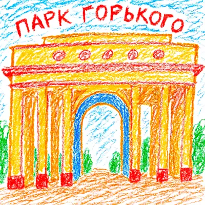 Входная арка парка имени Горького. Известное любому москвичу место. Рисовалось цветными карандашами. Мы очень любим парк Горького и захотели его продемонстрировать в нашей интерпретации.