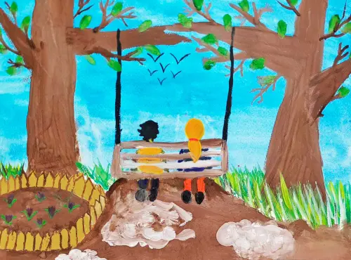 Салиха в своей работе изобразила летний погожий день во дворе. Подвесные качели между деревьями - очень романтично и уютно! Во дворе Салихи много цветов и зелени, ясное небо и дети на качелях, именно так девочка себе представила отдых во дворе своего дома.