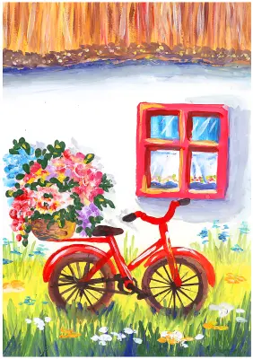 На рисунке изображён домик — видно часть крыши и окно. Перед домом зелёная трава, растут яркие цветы. Рядом стоит красный велосипед, а на его багажнике — горшок с цветами. Всё выглядит солнечно, по-летнему и очень уютно, как будто тёплое лето у бабушки в деревне.