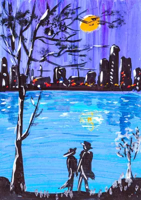 На рисунке мужчина и женщина стоят рядом и смотрят на воду. За водой виден ночной город, а в воде отражается луна. Рядом с ними растёт дерево. Вся сцена выглядит спокойно и немного задумчиво.