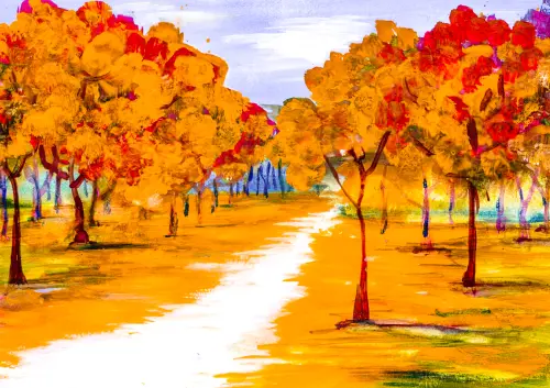 На рисунке осень — всё вокруг в тёплых жёлтых тонах. По бокам стоят деревья с ярко-жёлтыми листьями, которые ещё не опали. Посередине между ними тянется узкая тропинка, словно ведущая в тихое, спокойное место. Вся сцена наполнена мягким светом и ощущением ранней осени.