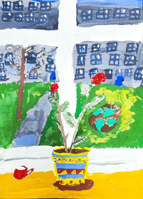 Василиса очень оригинально изобразила свой двор: вид через окно из квартиры. Девочка проживает в многоквартирном доме, из окна виден дом напротив, двор очень зелёный, на улице летний погожий день. Работа выполнена гуашью.