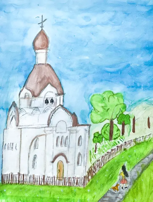 На картине запечатлен тихий летний день, где церковь с коричневыми куполами, словно греется в солнечных лучах. Тёплые оттенки куполов создают, уютное впечатление. К храму ведёт тропинка, теряющаяся где-то за краем полотна - та самая дорожка к метро (Багратионовская). По ней шагает девушка с собакой.