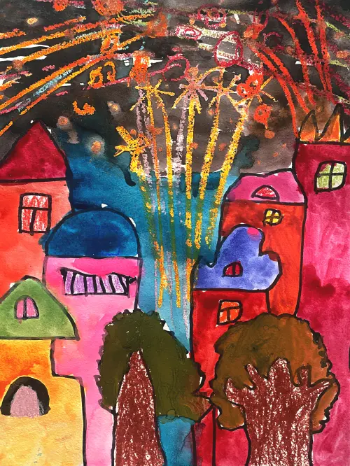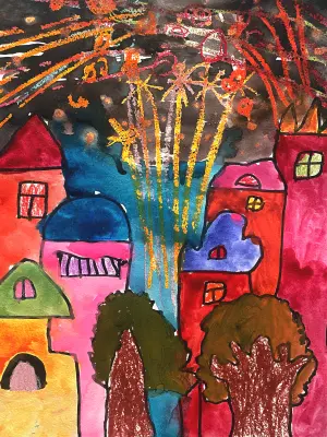 На рисунке изображен родной город Москва, район Филевский парк. Салют на темном небе. Работа выполнена акварельными красками в возрасте ребенка пяти лет.