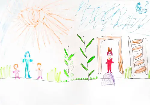 Маша нарисовала свою любимую игровую площадку возле дома, где она любит гулять со своими братьями и сёстрами. Маше очень нравится учиться различным трюкам, лазить и висеть на турниках.