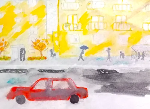 Моя школа находится не очень далеко от дома и я люблю ходить туда пешком. Но когда на улице плохая погода и льет дождь, мама отвозит меня на машине. Такие дни мне тоже нравятся, потому что мы едем по улицам, смотрим на новые дома и слушаем музыку.