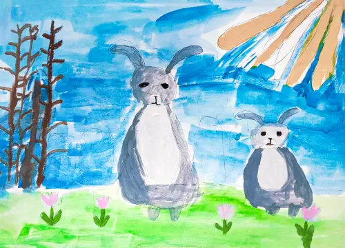 София любит гулять в парке Кусково со своими родителями и бабушкой. Она нарисовала как однажды встретила в траве двух зайчат, они были очень забавные и беззащитные. Софии они так понравились, что она решила именно их изобразить. Работа выполнена гуашью.