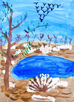 Дарьяна изобразила осень в парке Кусково. Листвы на деревьях уже нет, в небе косяк птиц улетает на юг, кусты возле озера уже немного припорошены снегом. Девочка любит парк Кусково, часто там бывает и наблюдает за изменениями в природе осенью. Работа выполнена гуашью.
