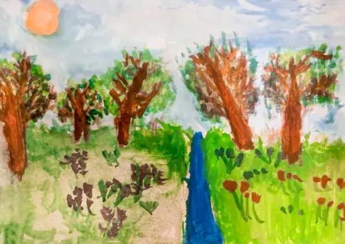 Матвей проживает со своими родителями в доме возле парка. Он часто ходит туда гулять. Матвей изобразил лесопарк летним днем, вокруг деревья, трава и цветы, тропинка через парк так и манит прогуляться. Работа выполнена гуашью.