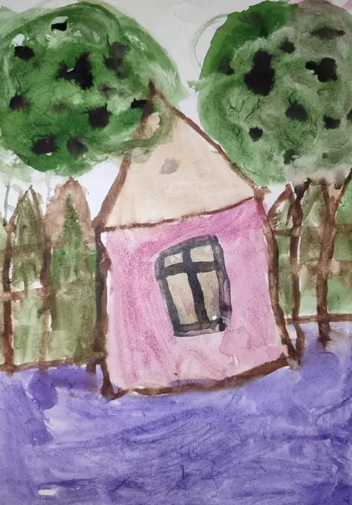 Я нарисовал наш уютный дом, куда мы с родителями и младшим братишкой ездим отдыхать на лето к дедушке и бабушке. Там рядом есть еще и озеро, но его я не стал рисовать.