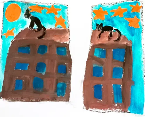 Из окна нашего дома видны соседние дома. Я люблю смотреть в окно, и однажды я увидела на крыше соседнего дома двух чёрных кошек. Они громко мяукали и, наверное, не давали спать соседям.