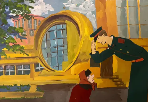 На рисунке изображено необычное здание в форме огромной автомобильной фары — это знаменитый гараж Госплана, созданный архитектором Мельниковым. Фасад здания напоминает фару автомобиля, а административный корпус похож на решётку радиатора. На переднем плане разворачивается добрая история: всеми любимый персонаж Дядя Стёпа помогает пожилой женщине. Великан Дядя Стёпа, нарисованный в мультяшном стиле.