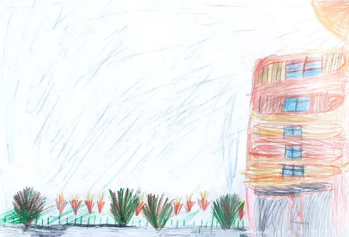 Летом у нас на районе очерь красиво, все зеленое, яркое, живое. В нашем районе много парков, красивых домов, захотелось передать эту красоту своим рисунком.
